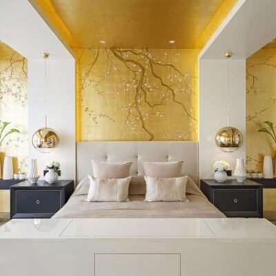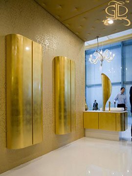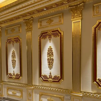 In living rooms, hotel lobbies, reception areas, and upscale interiors, gold leaf wall finishes make a powerful statement. The reflective surface gives ornamental walls more depth and improves lighting.